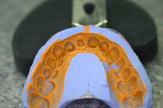 Nach dem Guss und der Überarbeitung wird auf dieser Fläche dann Keramikpulver in den verschiedenen Schichten aufgebrannt und immer wieder überarbeitet und korrigiert, bis die Verblendschale auf der Krone die richtige Form hat.