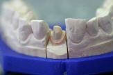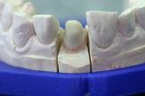 Will man aber nun eine vollständig verblendete Krone, wird lediglich ein dünnes Wachskäppchen auf dem Zahnstumpf des Gipsmodells hergestellt und nach dem Gussverfahren komplett mit Keramik aufgebrannt.